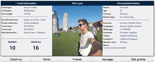 Upload pictures, manage your journey, maintain your community, create your bio, interest, languages, travel status, schedule and much more. A full profile makes it easier to connect to fellow travelers.